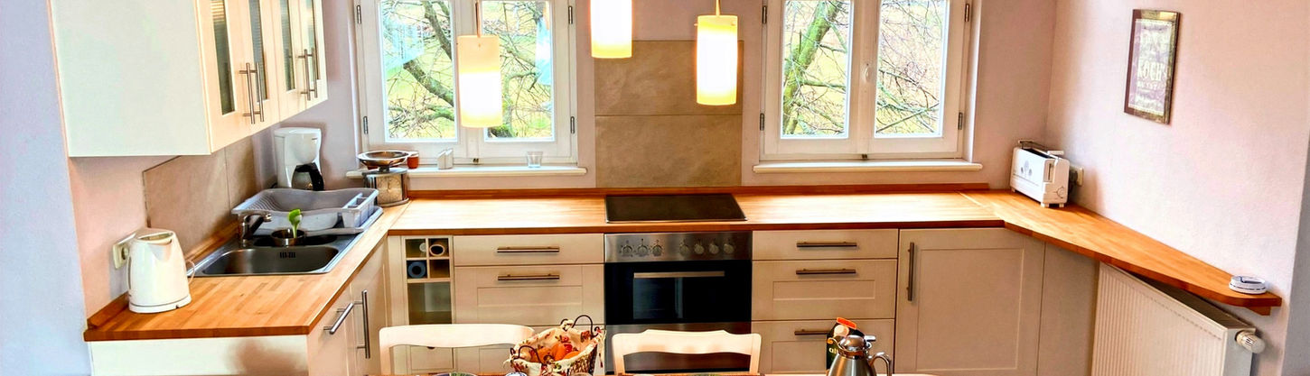 Backofen, Herd, Kühlschrank, Geschirrspülmaschine, Kaffemaschine, Wasserkocher und Toaster vorhanden